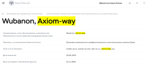 По реестру Банка России axiomway.org внесён в список компаний с признаками нелегального профессионального участника рынка ценных бумаг (признаки мошенничества и недобросовестных практик).