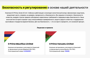 - VU FSC (Вануату) — номер 700238 для D Prime Vanuatu Limited