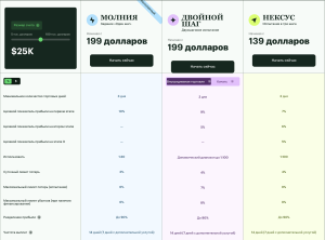 Аккаунты доступны от 25 000 долларов и выше (до очень крупных размеров). Разделение прибыли достигает 90%, выплаты происходят раз в 14 дней (или раз в 7 дней с дополнительной услугой). Правила просадки, целевые показатели прибыли и плечо зависят от выбранного плана.
