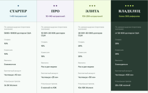 - ВЛАДЕЛЕЦ (более 300 рефералов) — выручка от 50 000 долларов США, скидка 25%, комиссия 25%, выплата еженедельно