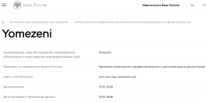 - Чёрный список ЦБ РФ — Yomezeni официально внесён в список компаний с признаками нелегальной деятельности на сайте Банка России. Это значит, что регулятор РФ считает проект нелегальным и опасным для граждан России.